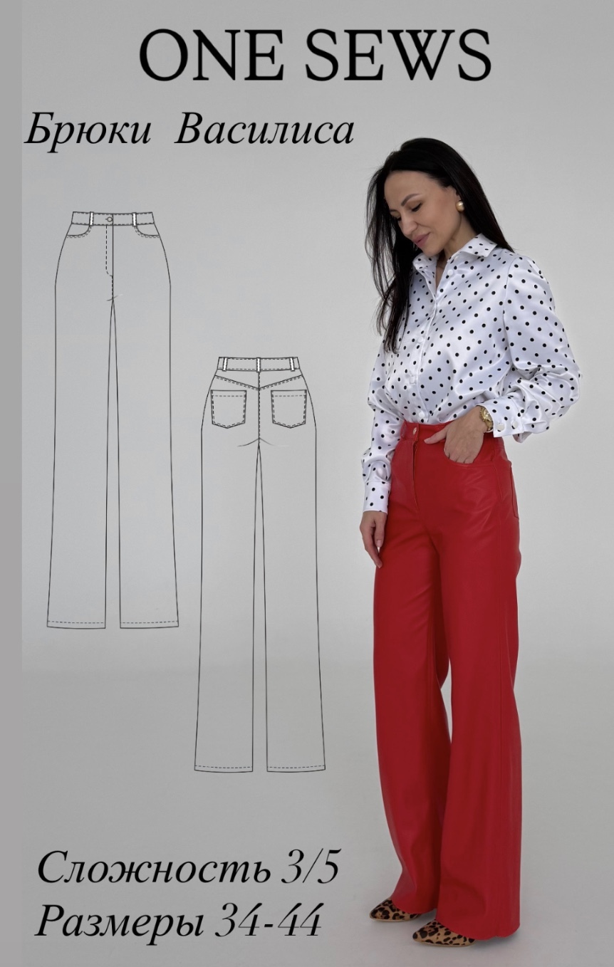 Брюки малого объема, прямого силуэта. На передних половинках брюк карманы с отрезным бочком. На задних половинках отрезная кокетка и накладные карманы. Застежка брюк на гульфик с молнией, на поясе брюки застегиваются на пуговицу и обметаную петлю, пояс отрезной, притачной, на поясе настрочены шлевки. Верхний край брюк находится на естественной линии талии. Длина брюк в пол.
