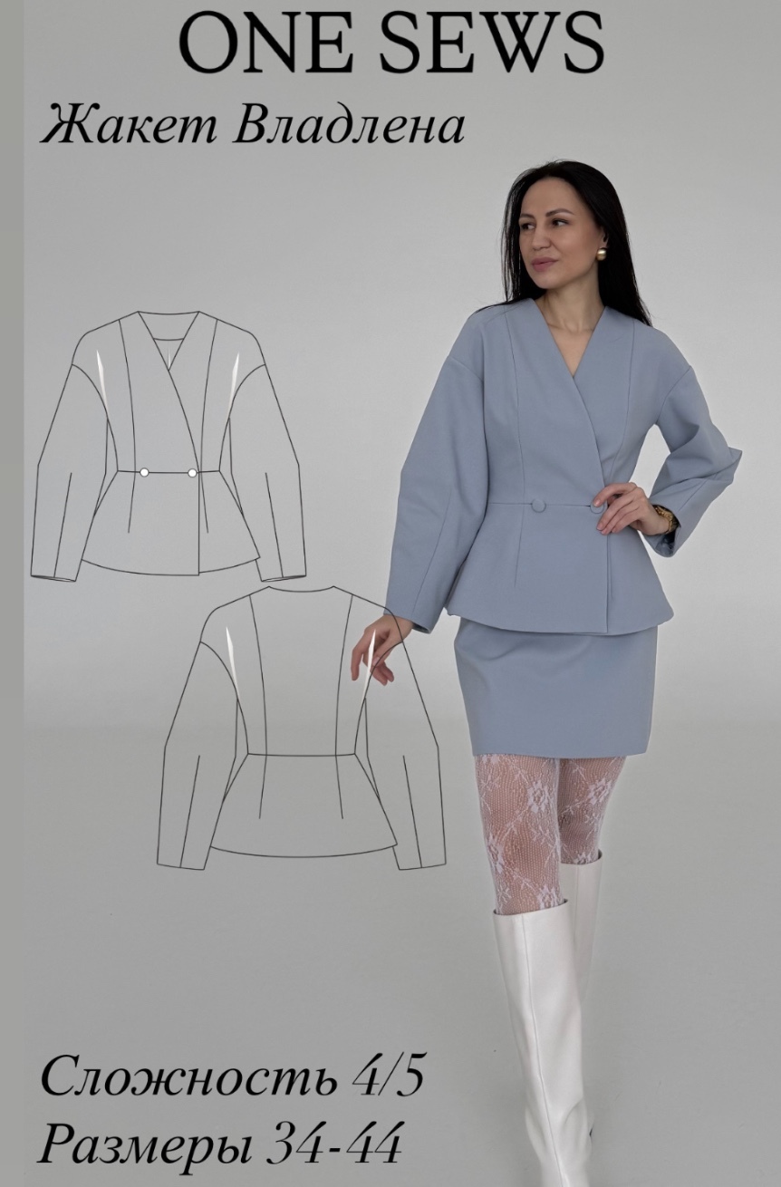 Выкройка двубортного жакета умеренного объема, приталенного силуэта. Силуэт достигается за счет рельефов на спинке и полочках. Жакет отрезной по линии талии с баской, на баске вытачки. Жакет на притачной подкладке. Вырез горловины глубокий V-образный. Линия плеча спущена, рукав втачной фигурный, форма рукава достигается за счет вытачек. Застежка жакета на обтяжные пуговицы и петли в шве на талии. Длина жакета до середины бедра.